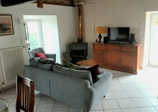 Au rez de chaussée, un grand séjour et salon (30 m²) avec un canapé trois places et deux fauteuils, une télévision à écran plat avec réception TNT et un poêle à bois. Particularité locale et rareté architecturale aussi, le séjour est sous une voûte de pierres, ce qui ajoute au charme de l’endroit.